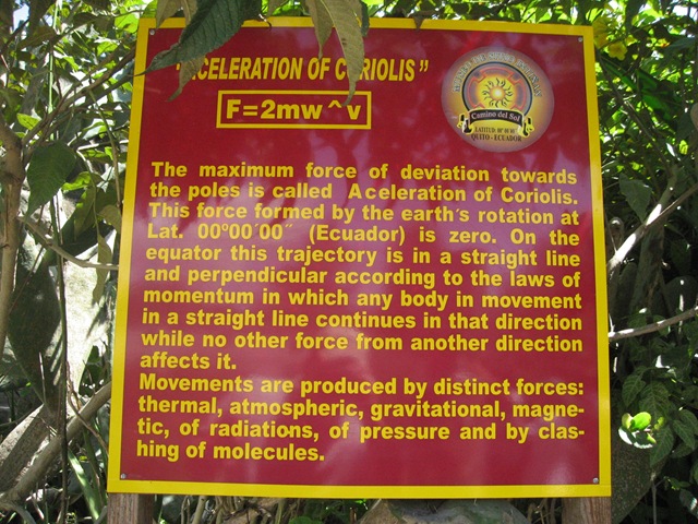 2008-04-23 Peru-Ecuador 2866One of the most mind bending demonstrations was of the Coriolis effect. This is the force that supposedly causes drains to flow in opposite directions depending if your in the northern or southern hemisphere. To demonstrate this behavior our guide took a mobile sink filled with water, pulled the plug, and tossed in some leaves to show the direction the drain was flowing. He did this 3 times: once on the equator (no drain rotation), once on the South side (clockwise), and finally once on the North side (counter-clockwise). Some say it’s a trick. Here’s the video for you to decide.